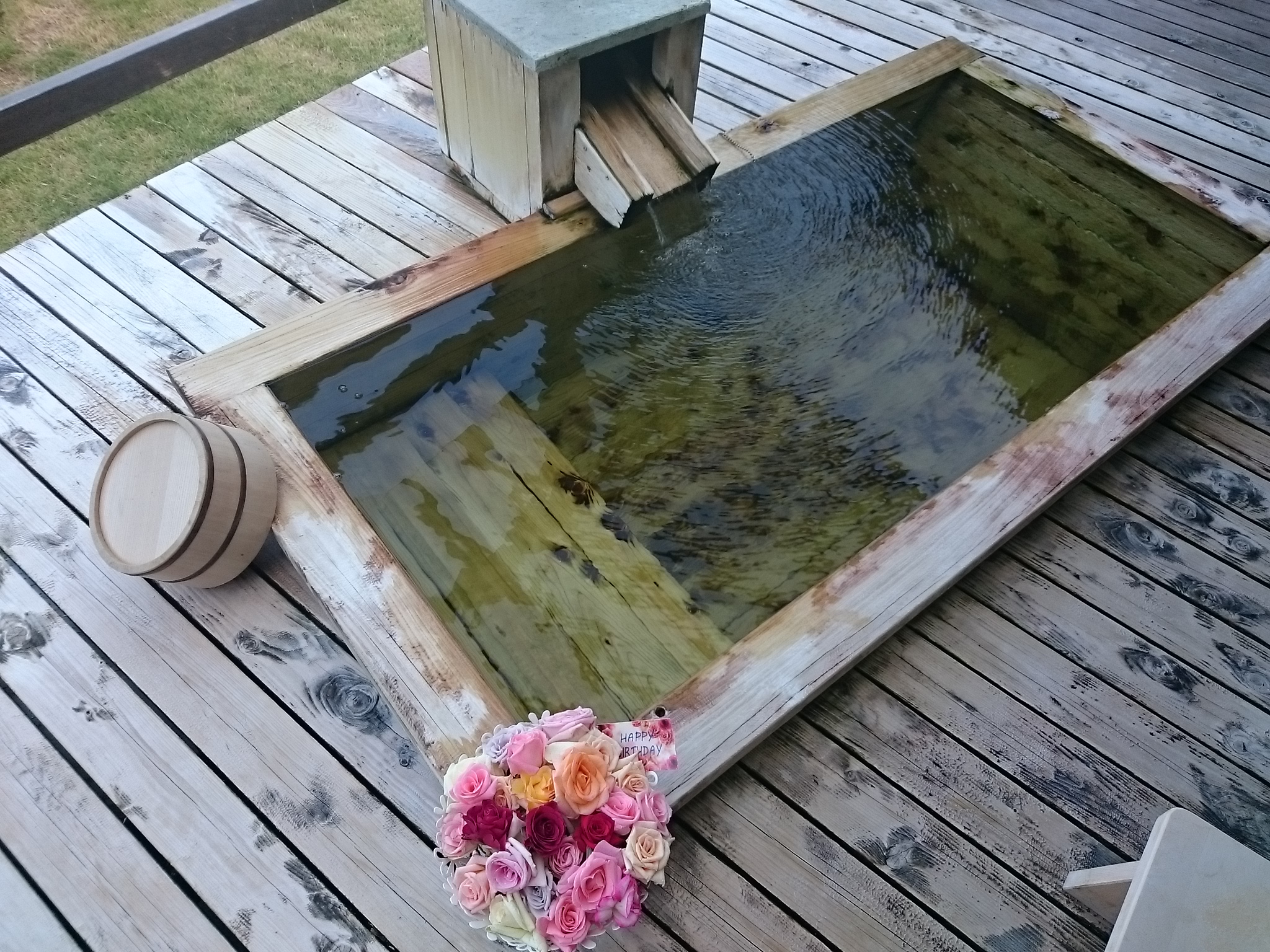HAPPY BIRTHUDAYのカードとバラ風呂のプレゼントが…