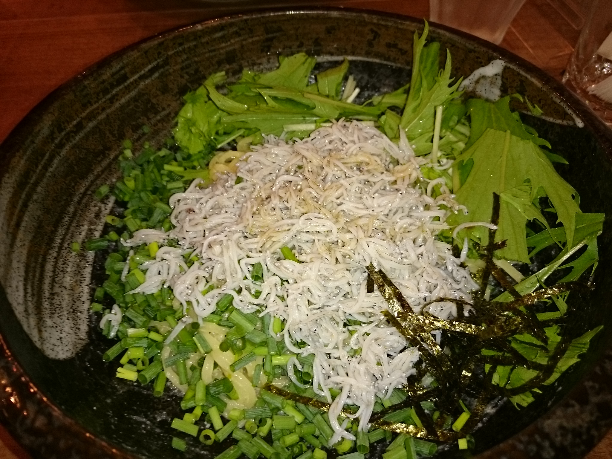私とOさんが一緒のテーブルで しらすと水菜の入ったパスタ