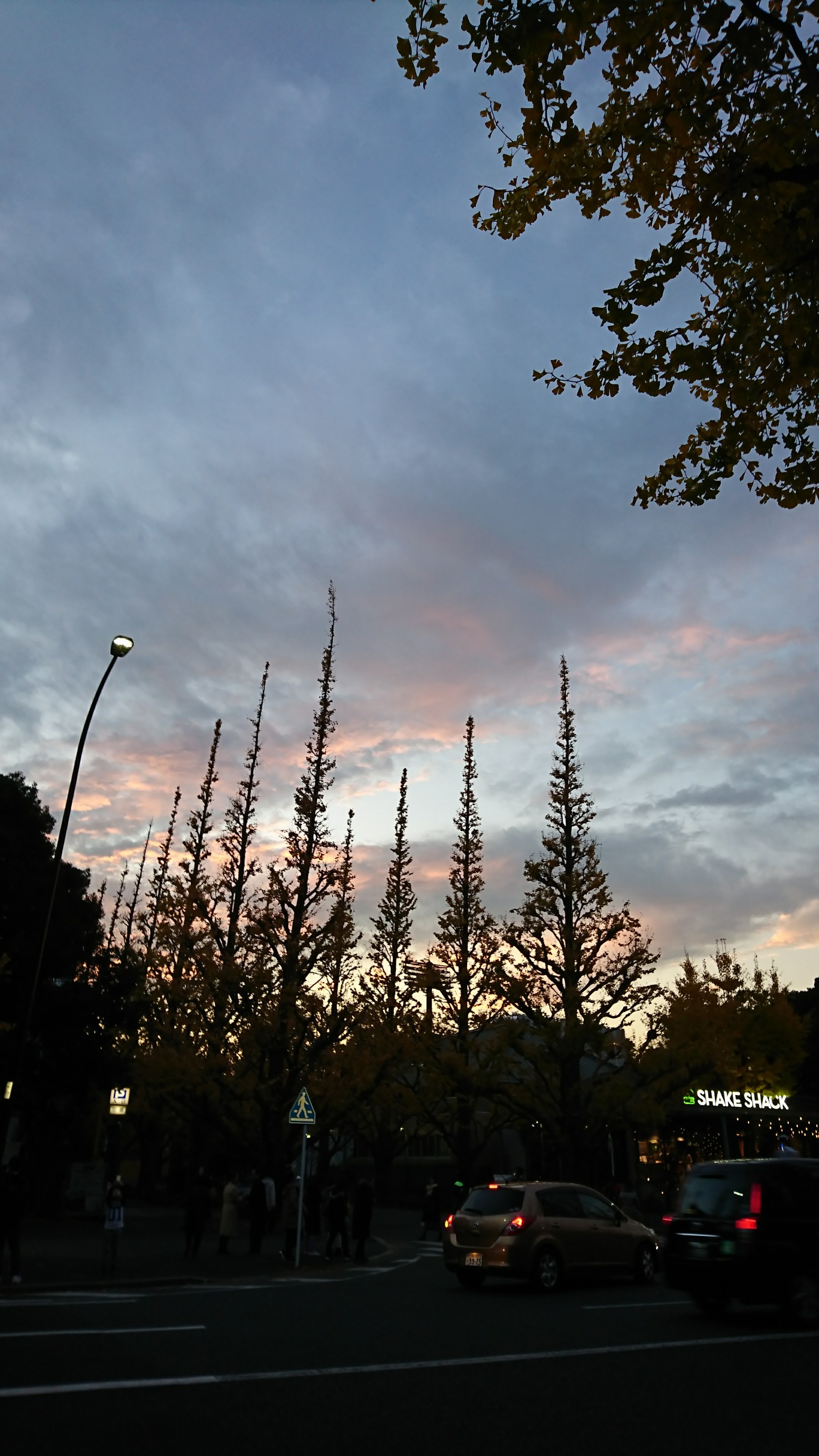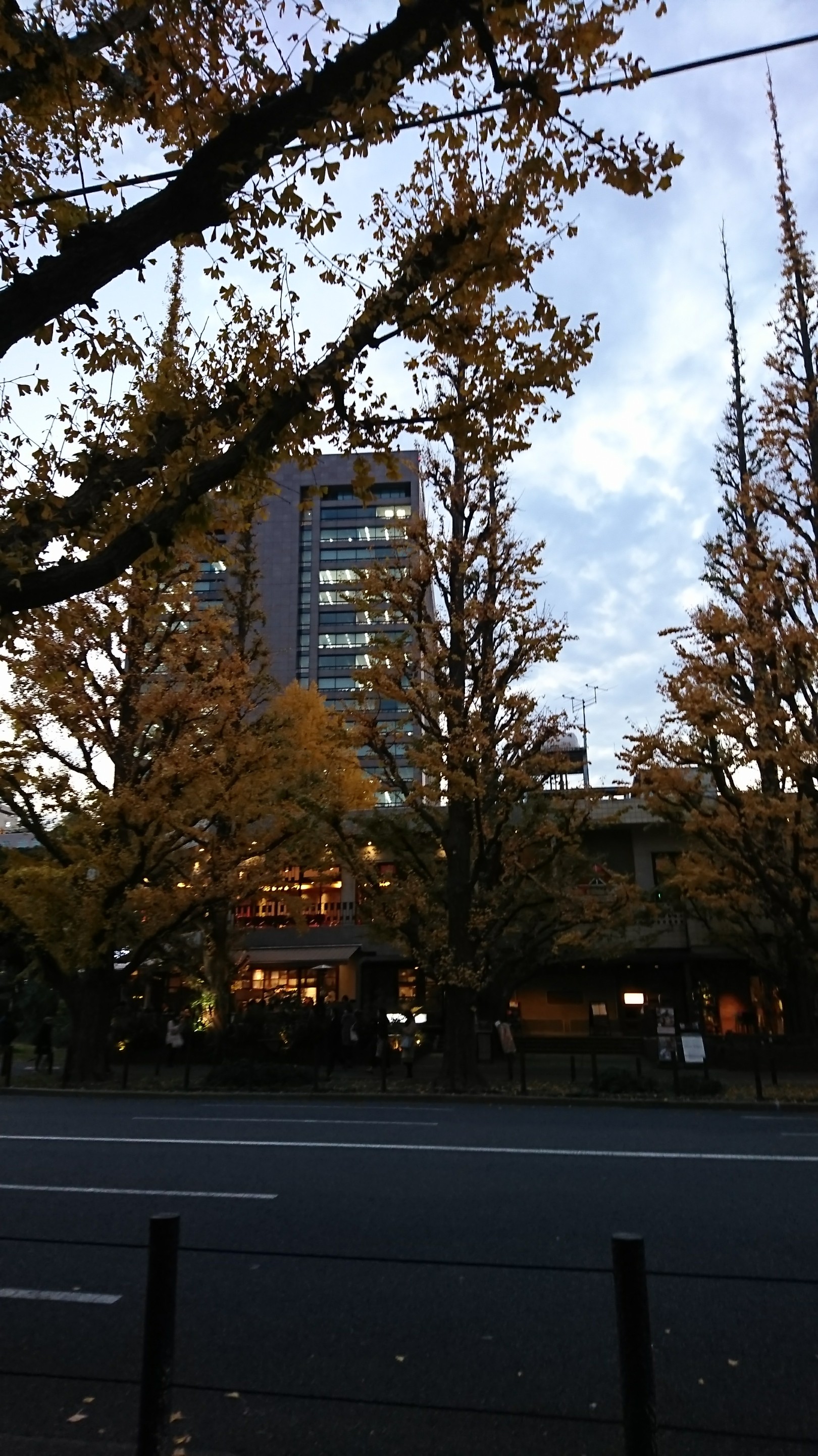 夕暮れの 都会の黄色いイチョウ並木。
