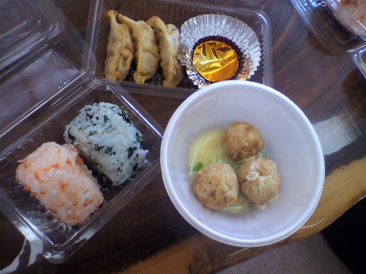 おにぎりと揚げ餃子、たこ焼き